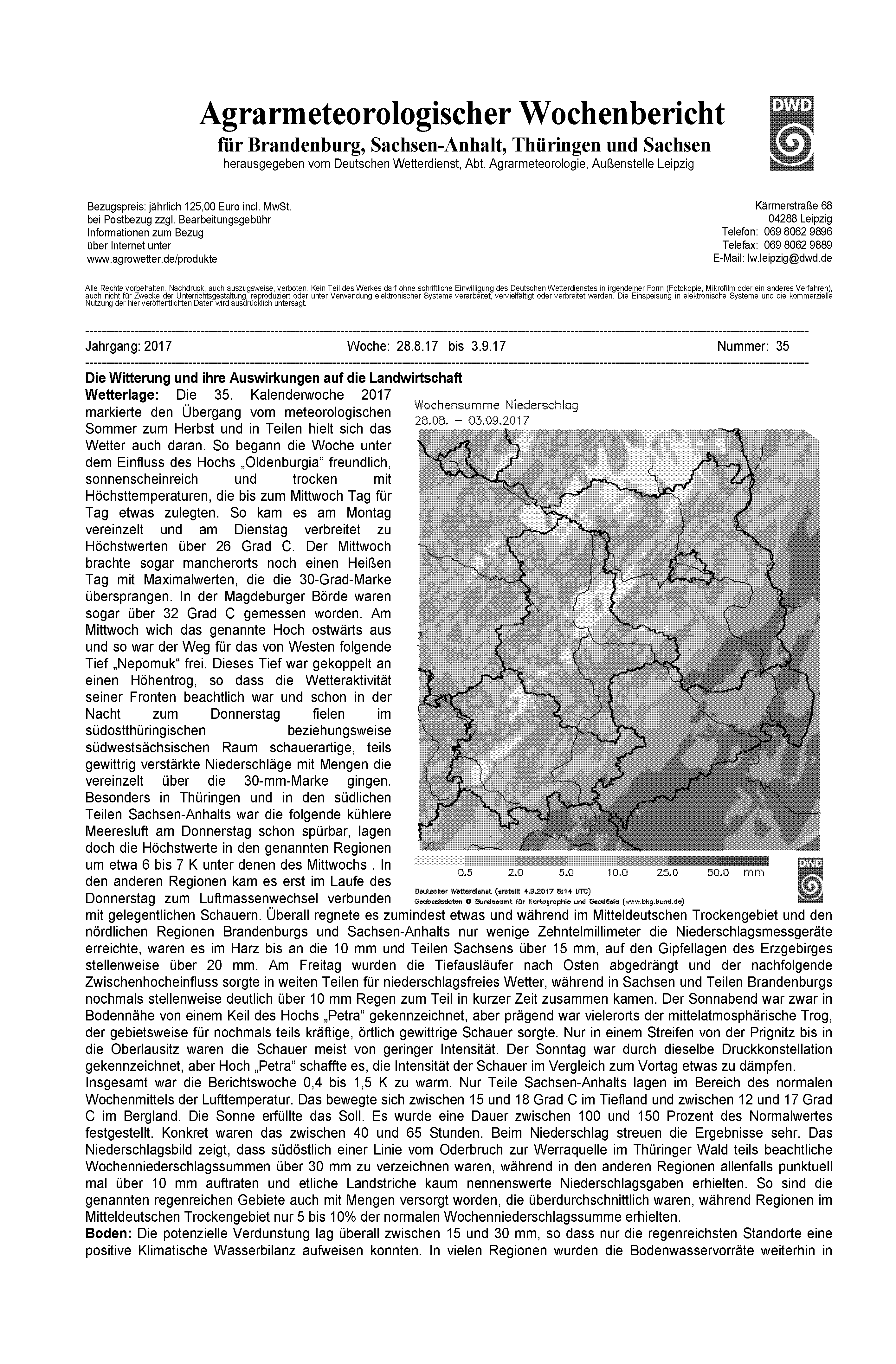 Agrarmeteorologischer Wochenbericht für Sachsen, Sachsen-Anhalt, Thüringen und B...