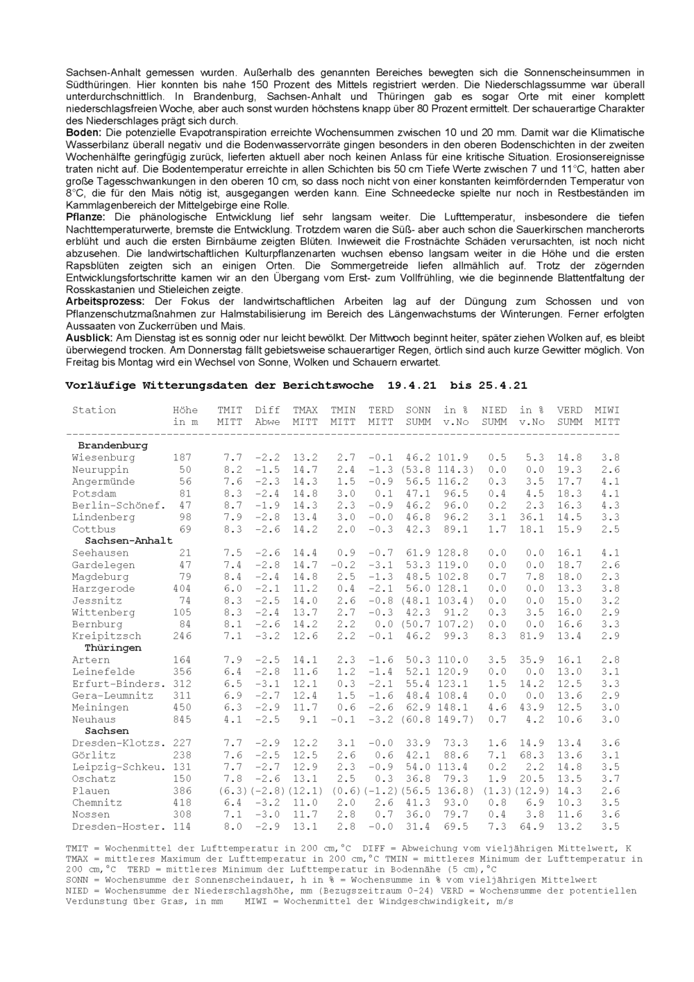 Agrarmeteorologischer Wochenbericht für Sachsen, Sachsen-Anhalt, Thüringen und B...
