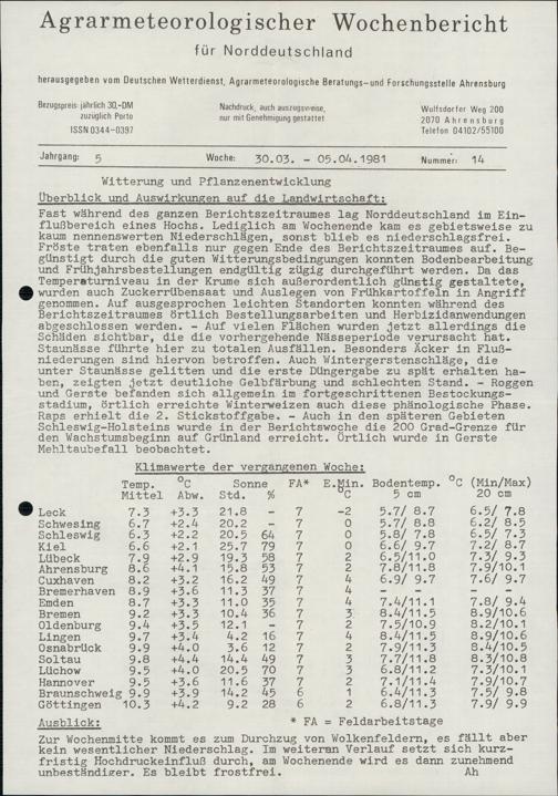 Agrarmeteorologischer Wochenbericht für Norddeutschland