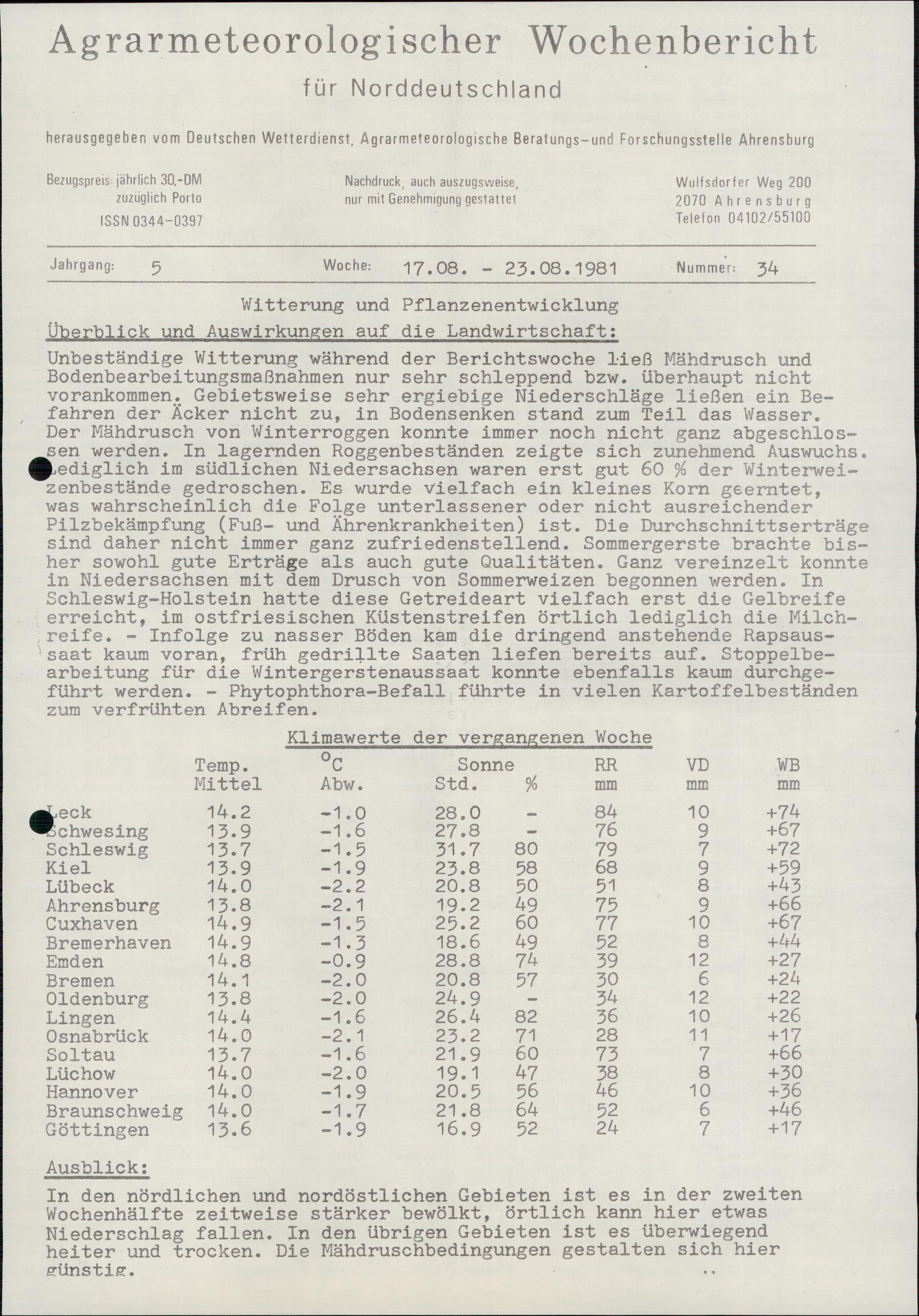 Agrarmeteorologischer Wochenbericht für Norddeutschland