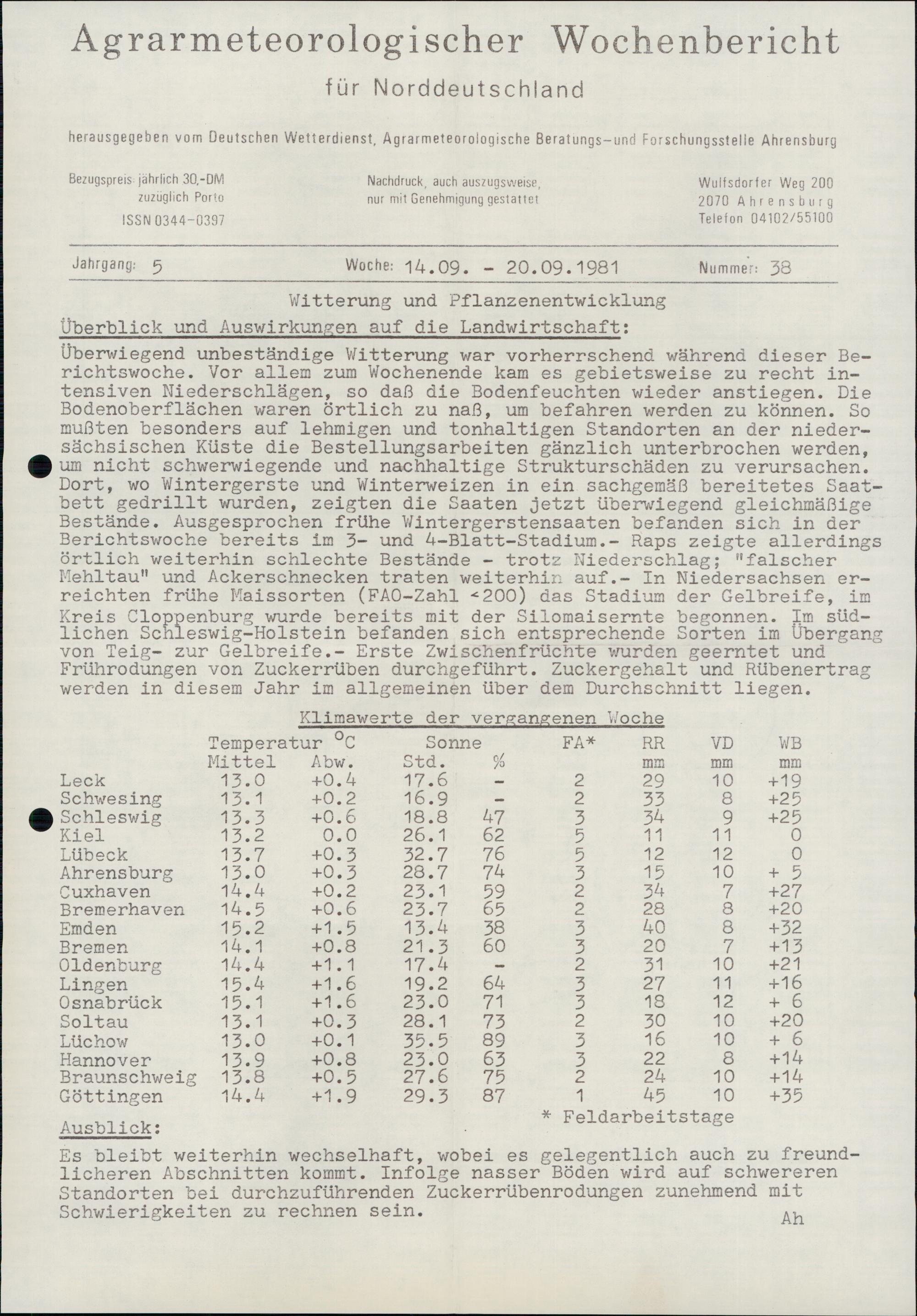 Agrarmeteorologischer Wochenbericht für Norddeutschland