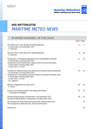 Der Wetterlotse : = Maritime meteo news / Deutscher Wetterdienst, DWD. Hamburg : Dt. Wetterdienst, Niederlassung Hamburg, 1 (2015)-6 (2021) ; damit Erscheinen eingestellt, 2015-2021 : (2017) H. 6. / CC-BY-Lizenz (4.0)